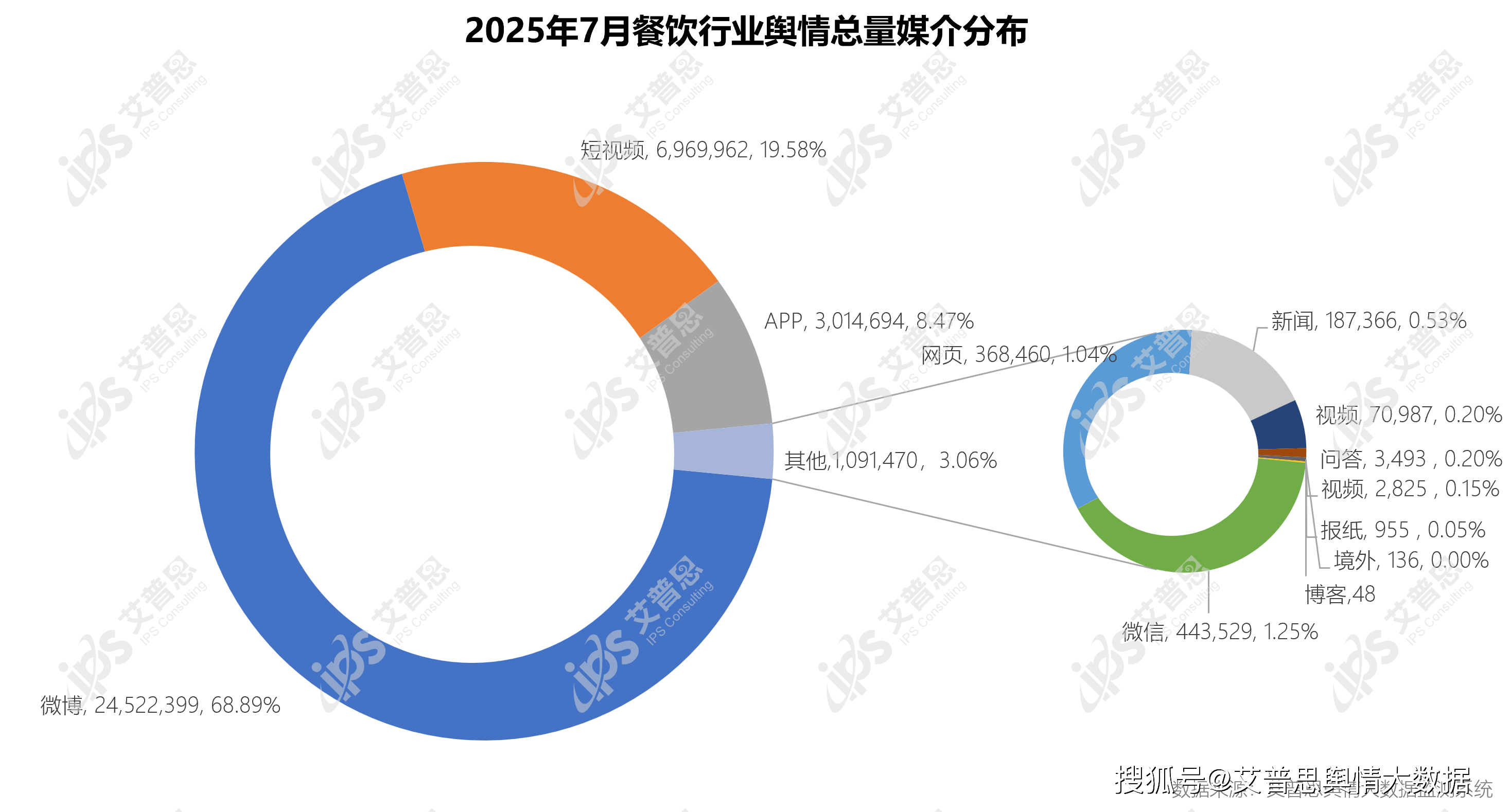 ;排名第三的是APP,舆情声量达3,014,694篇次,占比8。47%。其他前言中,微信、网页、旧事等前言的总占比达3。06%,舆情声量为1,091,470篇次。图3:2025年7月餐饮行业舆情总量前言分布。